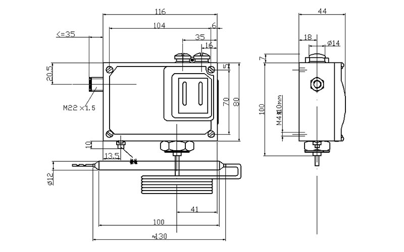 541/7T溫度控制器采用帶毛細管溫包式傳感器,可用于流動的中性氣體和液體介質,如果介質為腐蝕性,安裝時可選用不銹鋼溫包保護套套在銅質溫包外(見附件)。541/7T溫度控制器的設定值可調,調節范圍-30~280℃。
